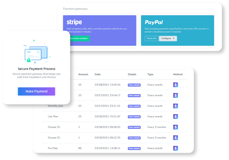 Integrate multiple payment gateways in the same form, without needing code like Stripe and PayPal. We are adding new gateways constantly.