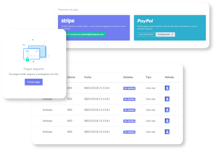 Ofrecemos cifrado SSL de 256 bits y pasarelas seguras como Stripe para procesar sus pagos de forma segura.